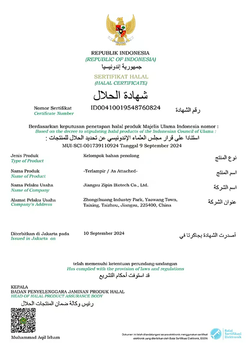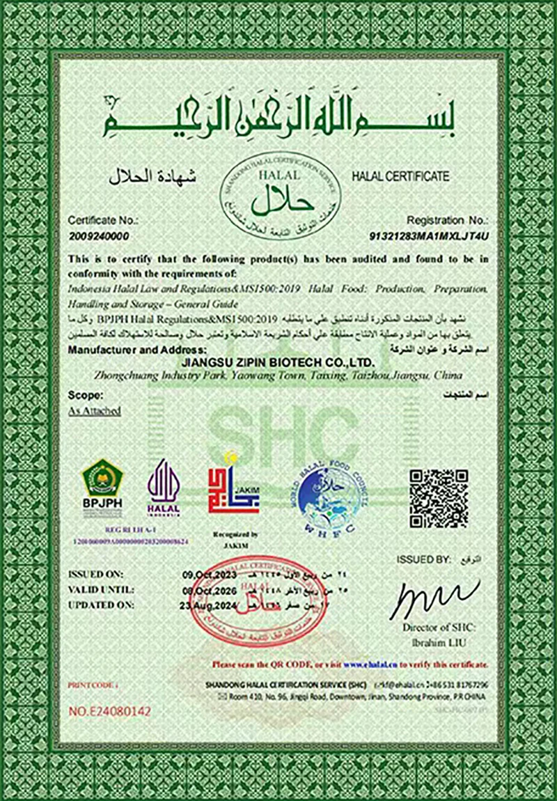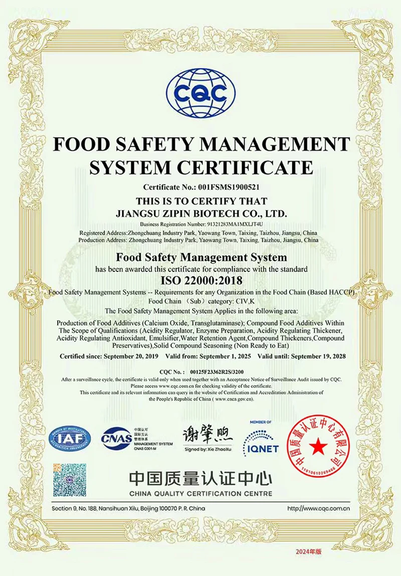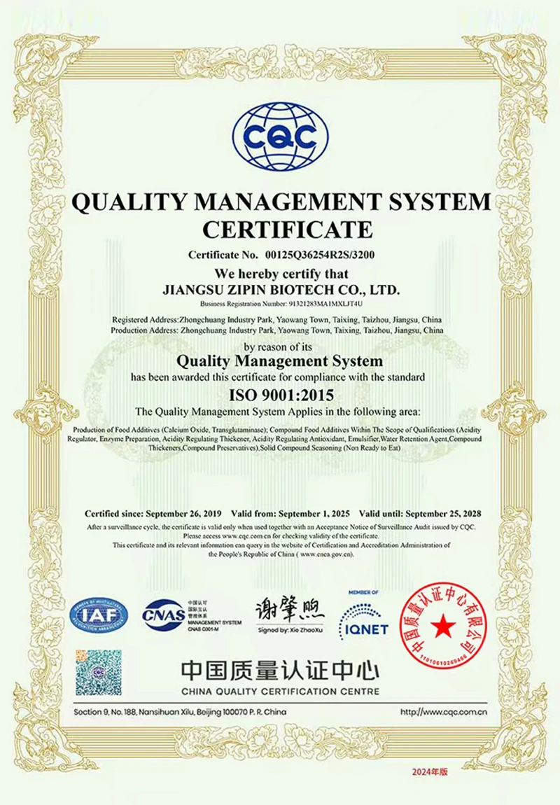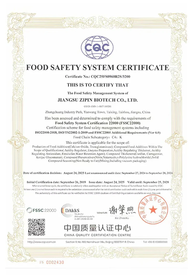 Jiangsu Zipin Co Biotech, Ltd Jiangsu Zipin Co Biteicneolaíochta, Ltd. Bunaíodh i 2016, ag clúdach réimse de 20,000㎡. Mar fhiontar príobháideach nua-aimseartha, táimid ag gabháil go príomha anois le T&F, táirgeadh agus díol breiseán bia. Is iad na príomh-tháirgí atá againnTrasglutaminase, Curdlan, ε-polailísín, Nisin, Natamycin agus breiseáin bia eile.